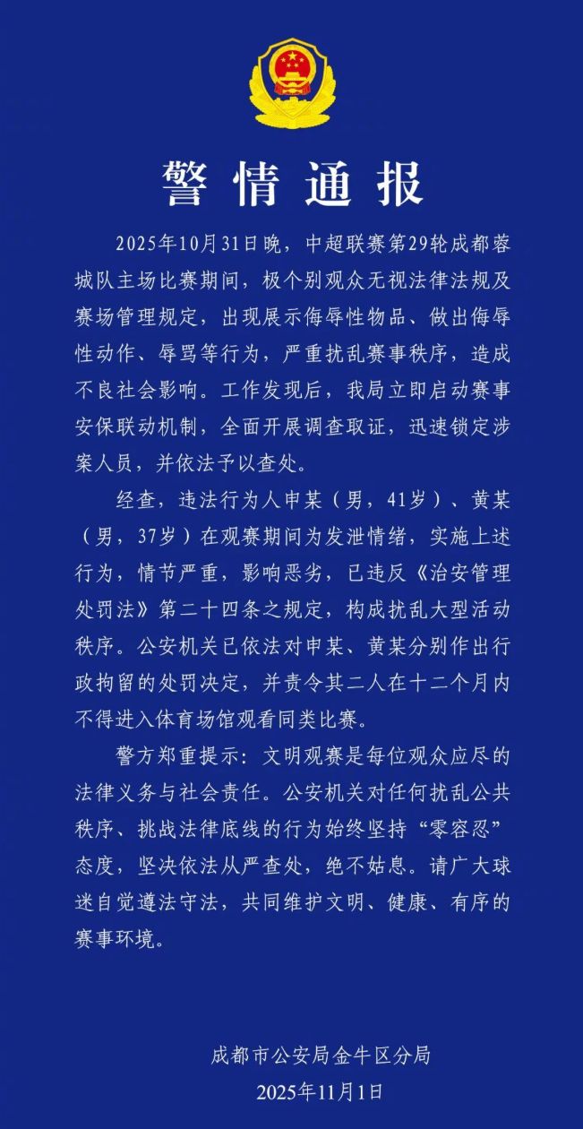 11月1日,成都市公安局金牛区分局发布公告,宣布对两名狂热分子进行处罚。 “2025年10月31日晚,中超成都足球队第29轮主场比赛中,少数观众无视法律法规和场馆管理规定,展示攻击性物品,做出侮辱性行为,侮辱他人,严重扰乱比赛秩序。”此事发现后,有关部门立即建立赛事安全协调机制,开展彻底调查。经调查,肇事者为沉某(男,41岁)、黄某(男,41岁)。 37岁的他在观看比赛时做出上述行为是为了发泄情绪。事态严重,负面影响巨大。该行为违反治安管理处罚法第二十四条规定,违反管理法,构成扰乱大型活动秩序的行为。 “公安机关已分别依法对沉某、黄某采取了行动。此前,在成都中超第29轮主场比赛中,有球迷对场上球员进行侮辱、歧视行为,引起广泛关注。”警方在处罚后表示:“他们踢球文明,观看比赛是所有观众的法律义务和社会责任。对于任何扰乱公共秩序、挑战合法利益的行为,公安机关始终保持零容忍态度。我们将坚决查处,依法从严处理,决不姑息。” “请广大球迷自觉遵守法律,共同维护文明、健康、有序的赛事环境。”